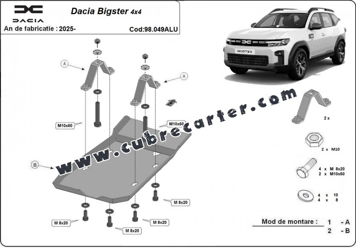 El cubre carter metalico es nuevo y se adapta perfectamente al Dacia Bigster, con las siguientes versiones de motor / accionamiento: toate, fabricado entre 2025 y 2025. La placa protega los siguientes: diferencial Está preparado de chapa de Aluminio de 4 mm. Los escudos son de aluminio, pero los soportes de fijación son de acero. Cerrojos, calces y todos los accesorios incluidos. Todas las placas son estrachadas con pintura de polvo anticorrosivo. Las placas del protección del motor son equipados con braceares soldados para resistir mejor a los impactos exteriores. |