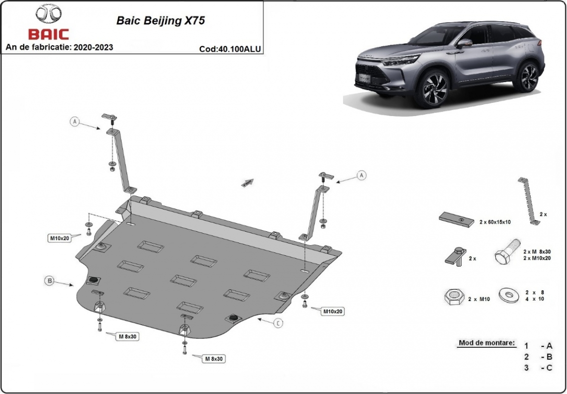 El cubre carter metalico es nuevo y se adapta perfectamente al BAIC Beijing X75, con las siguientes versiones de motor / accionamiento: toate, fabricado entre 2020 y 2023. La placa protega los siguientes: motor, caja de cambios, radiador Está preparado de chapa de Aluminio de 3 mm. Los escudos son de aluminio, pero los soportes de fijación son de acero. Cerrojos, calces y todos los accesorios incluidos. Todas las placas son estrachadas con pintura de polvo anticorrosivo. Las placas del protección del motor son equipados con braceares soldados para resistir mejor a los impactos exteriores. |