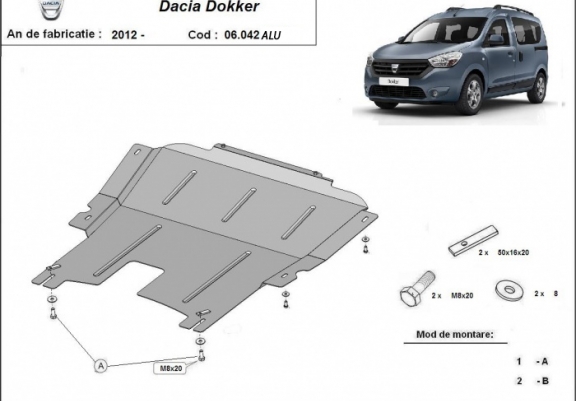 El cubre carter metalico es nuevo y se adapta perfectamente al Dacia Dokker, con las siguientes versiones de motor / accionamiento: toate, fabricado entre 2012 y 2026. La placa protega los siguientes: motor, caja de cambios Está preparado de chapa de Aluminio de 4 mm. Los escudos son de aluminio, pero los soportes de fijación son de acero. Cerrojos, calces y todos los accesorios incluidos. Todas las placas son estrachadas con pintura de polvo anticorrosivo. Las placas del protección del motor son equipados con braceares soldados para resistir mejor a los impactos exteriores. |