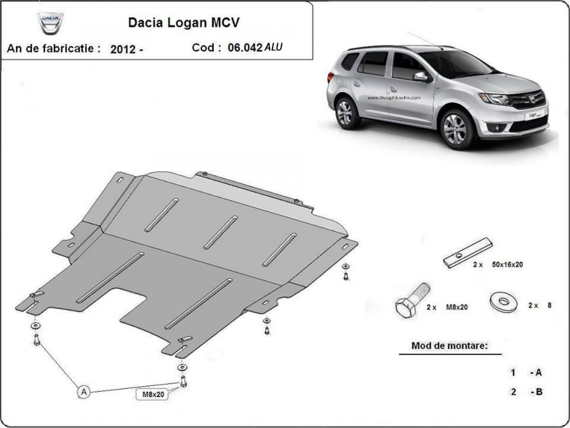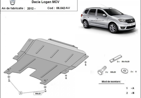 El cubre carter metalico es nuevo y se adapta perfectamente a todas las versiones de DACIA LOGAN MCV fabricadas entre 2012 y 2020. La placa protega los siguientes: motor, caja de cambios Está preparado de chapa de Aluminio de 4 mm. Los escudos son de aluminio, pero los soportes de fijación son de acero. Cerrojos, calces y todos los accesorios incluidos. Todas las placas son estrachadas con pintura de polvo anticorrosivo. Las placas del protección del motor son equipados con braceares soldados para resistir mejor a los impactos exteriores. |