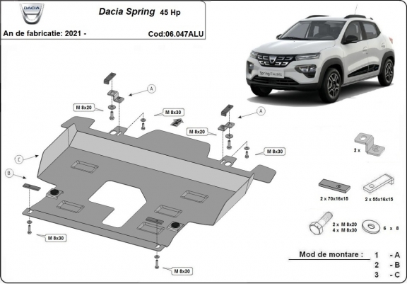 El cubre carter metalico es nuevo y se adapta perfectamente a todas las versiones de Dacia Spring fabricadas entre 2021 y 2026. La placa protega los siguientes: motor, caja de cambios, radiador Está preparado de chapa de Aluminio de 4 mm. Los escudos son de aluminio, pero los soportes de fijación son de acero. Cerrojos, calces y todos los accesorios incluidos. Todas las placas son estrachadas con pintura de polvo anticorrosivo. Las placas del protección del motor son equipados con braceares soldados para resistir mejor a los impactos exteriores. |