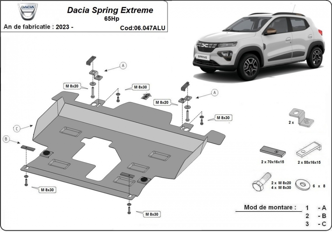 El cubre carter metalico es nuevo y se adapta perfectamente al Dacia Spring, con las siguientes versiones de motor / accionamiento: toate, fabricado entre 2023 y 2026. La placa protega los siguientes: motor, caja de cambios, radiador Está preparado de chapa de Aluminio de 4 mm. Los escudos son de aluminio, pero los soportes de fijación son de acero. Cerrojos, calces y todos los accesorios incluidos. Todas las placas son estrachadas con pintura de polvo anticorrosivo. Las placas del protección del motor son equipados con braceares soldados para resistir mejor a los impactos exteriores. |