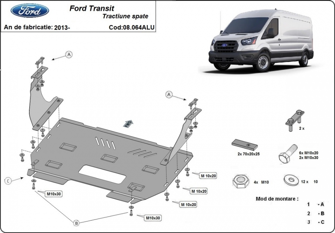 El cubre carter metalico es nuevo y se adapta perfectamente a todas las versiones de Ford Transit fabricadas entre 2013 y 2026. La placa protega los siguientes: motor, caja de cambios Está preparado de chapa de Aluminio de 3 mm. Los escudos son de aluminio, pero los soportes de fijación son de acero. Cerrojos, calces y todos los accesorios incluidos. Todas las placas son estrachadas con pintura de polvo anticorrosivo. Las placas del protección del motor son equipados con braceares soldados para resistir mejor a los impactos exteriores. |