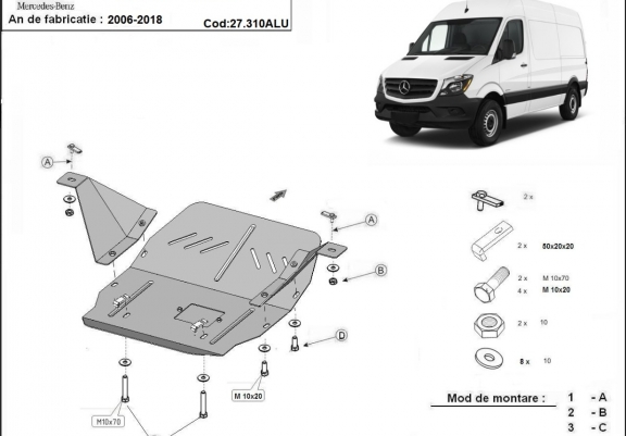 El cubre carter metalico es nuevo y se adapta perfectamente a todas las versiones de Mercedes Sprinter fabricadas entre 2006 y 2018. La placa protega los siguientes: motor, caja de cambios Está preparado de chapa de Aluminio de 3 mm. Los escudos son de aluminio, pero los soportes de fijación son de acero. Cerrojos, calces y todos los accesorios incluidos. Todas las placas son estrachadas con pintura de polvo anticorrosivo. Las placas del protección del motor son equipados con braceares soldados para resistir mejor a los impactos exteriores. |