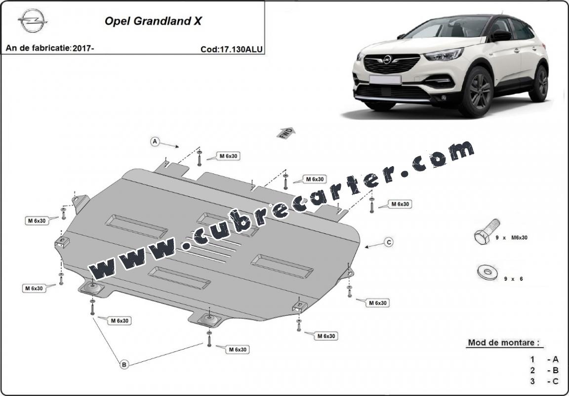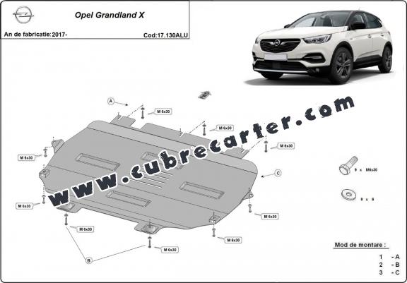 El cubre carter metalico es nuevo y se adapta perfectamente al Opel Grandland X, con las siguientes versiones de motor / accionamiento: toate, fabricado entre 2017 y 2026. La placa protega los siguientes: motor, caja de cambios, radiador, parachoques delantero Está preparado de chapa de Aluminio de 3 mm. Los escudos son de aluminio, pero los soportes de fijación son de acero. Cerrojos, calces y todos los accesorios incluidos. Todas las placas son estrachadas con pintura de polvo anticorrosivo. Las placas del protección del motor son equipados con braceares soldados para resistir mejor a los impactos exteriores. |