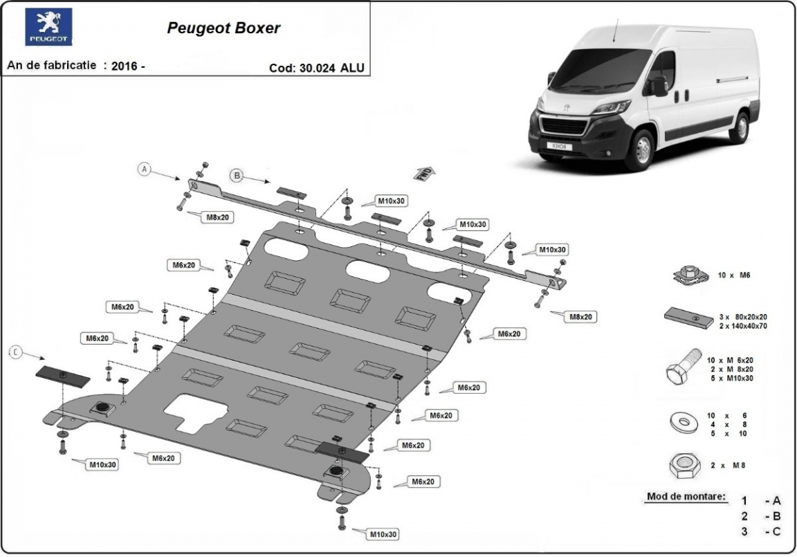 El cubre carter metalico es nuevo y se adapta perfectamente al Peugeot Boxer, con las siguientes versiones de motor / accionamiento: toate, fabricado entre 2016 y 2026. La placa protega los siguientes: motor, caja de cambios, radiador Está preparado de chapa de Aluminio de 4 mm. Los escudos son de aluminio, pero los soportes de fijación son de acero. Cerrojos, calces y todos los accesorios incluidos. Todas las placas son estrachadas con pintura de polvo anticorrosivo. Las placas del protección del motor son equipados con braceares soldados para resistir mejor a los impactos exteriores. |