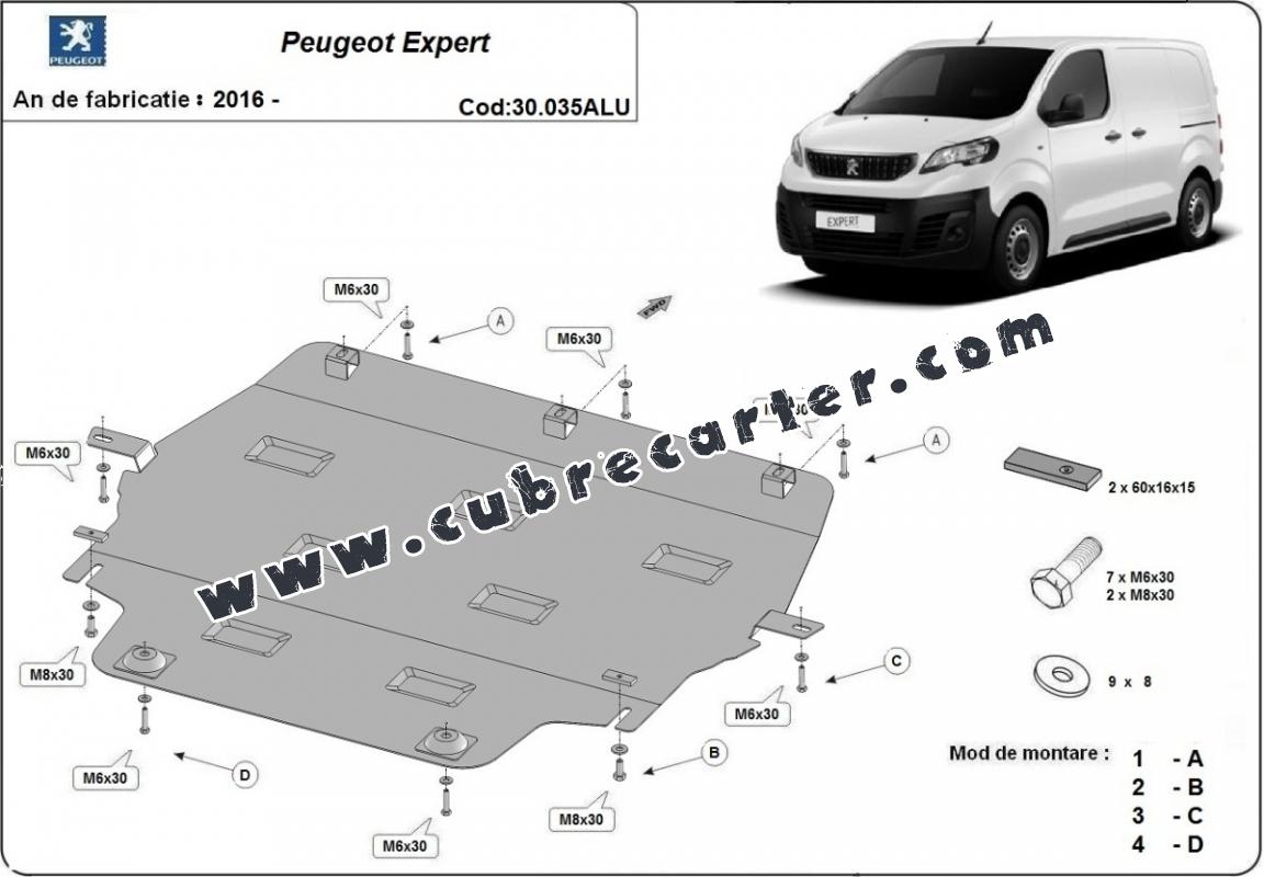 El cubre carter metalico es nuevo y se adapta perfectamente al Peugeot Expert, con las siguientes versiones de motor / accionamiento: toate, fabricado entre 2016 y 2026. La placa protega los siguientes: motor, caja de cambios, radiador Está preparado de chapa de Aluminio de 3 mm. Los escudos son de aluminio, pero los soportes de fijación son de acero. Cerrojos, calces y todos los accesorios incluidos. Todas las placas son estrachadas con pintura de polvo anticorrosivo. Las placas del protección del motor son equipados con braceares soldados para resistir mejor a los impactos exteriores. |