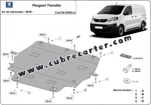 El cubre carter metalico es nuevo y se adapta perfectamente al Peugeot Traveller, con las siguientes versiones de motor / accionamiento: toate, fabricado entre 2016 y 2026. La placa protega los siguientes: motor, caja de cambios, radiador Está preparado de chapa de Aluminio de 3 mm. Los escudos son de aluminio, pero los soportes de fijación son de acero. Cerrojos, calces y todos los accesorios incluidos. Todas las placas son estrachadas con pintura de polvo anticorrosivo. Las placas del protección del motor son equipados con braceares soldados para resistir mejor a los impactos exteriores. |