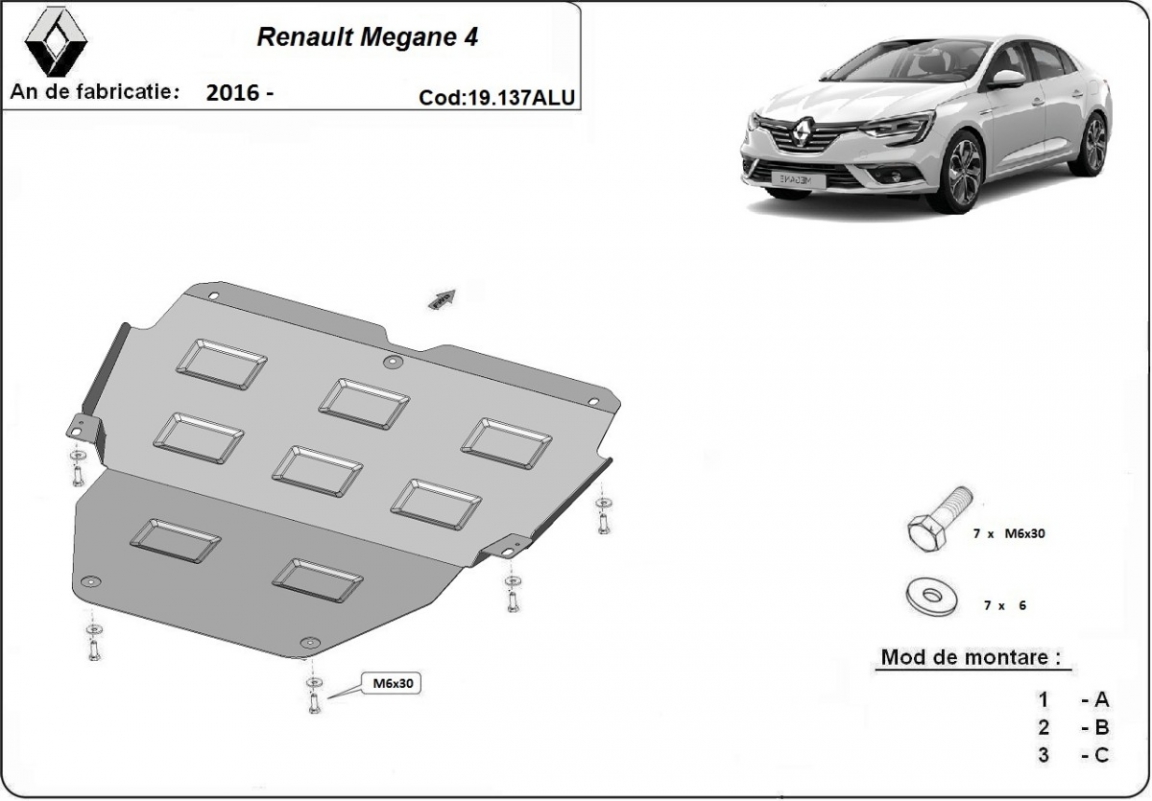 El cubre carter metalico es nuevo y se adapta perfectamente a todas las versiones de Renault Megane IV fabricadas entre 2016 y 2026. La placa protega los siguientes: motor, caja de cambios Está preparado de chapa de Aluminio de 3 mm. Los escudos son de aluminio, pero los soportes de fijación son de acero. Cerrojos, calces y todos los accesorios incluidos. Todas las placas son estrachadas con pintura de polvo anticorrosivo. Las placas del protección del motor son equipados con braceares soldados para resistir mejor a los impactos exteriores. |