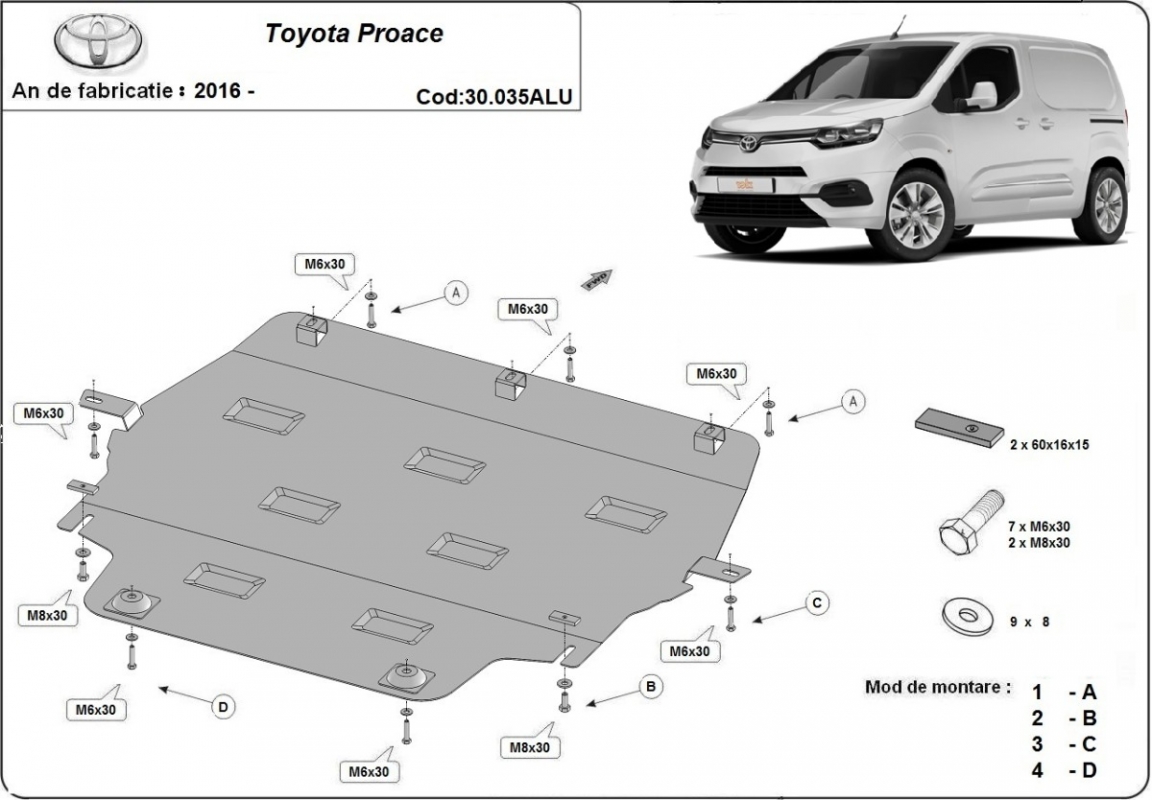 El cubre carter metalico es nuevo y se adapta perfectamente a todas las versiones de Toyota Proace fabricadas entre 2016 y 2026. La placa protega los siguientes: motor, caja de cambios, radiador Está preparado de chapa de Aluminio de 3 mm. Los escudos son de aluminio, pero los soportes de fijación son de acero. Cerrojos, calces y todos los accesorios incluidos. Todas las placas son estrachadas con pintura de polvo anticorrosivo. Las placas del protección del motor son equipados con braceares soldados para resistir mejor a los impactos exteriores. |