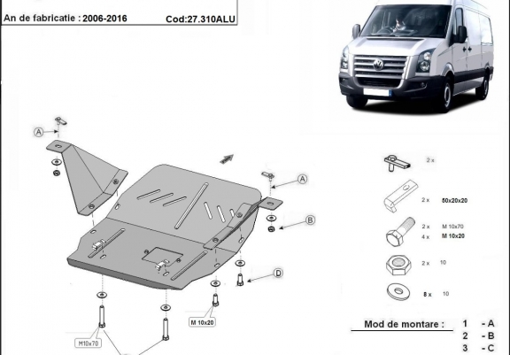 El cubre carter metalico es nuevo y se adapta perfectamente a todas las versiones de Volkswagen Crafter fabricadas entre 2006 y 2016. La placa protega los siguientes: motor, caja de cambios Está preparado de chapa de Aluminio de 3 mm. Los escudos son de aluminio, pero los soportes de fijación son de acero. Cerrojos, calces y todos los accesorios incluidos. Todas las placas son estrachadas con pintura de polvo anticorrosivo. Las placas del protección del motor son equipados con braceares soldados para resistir mejor a los impactos exteriores. |