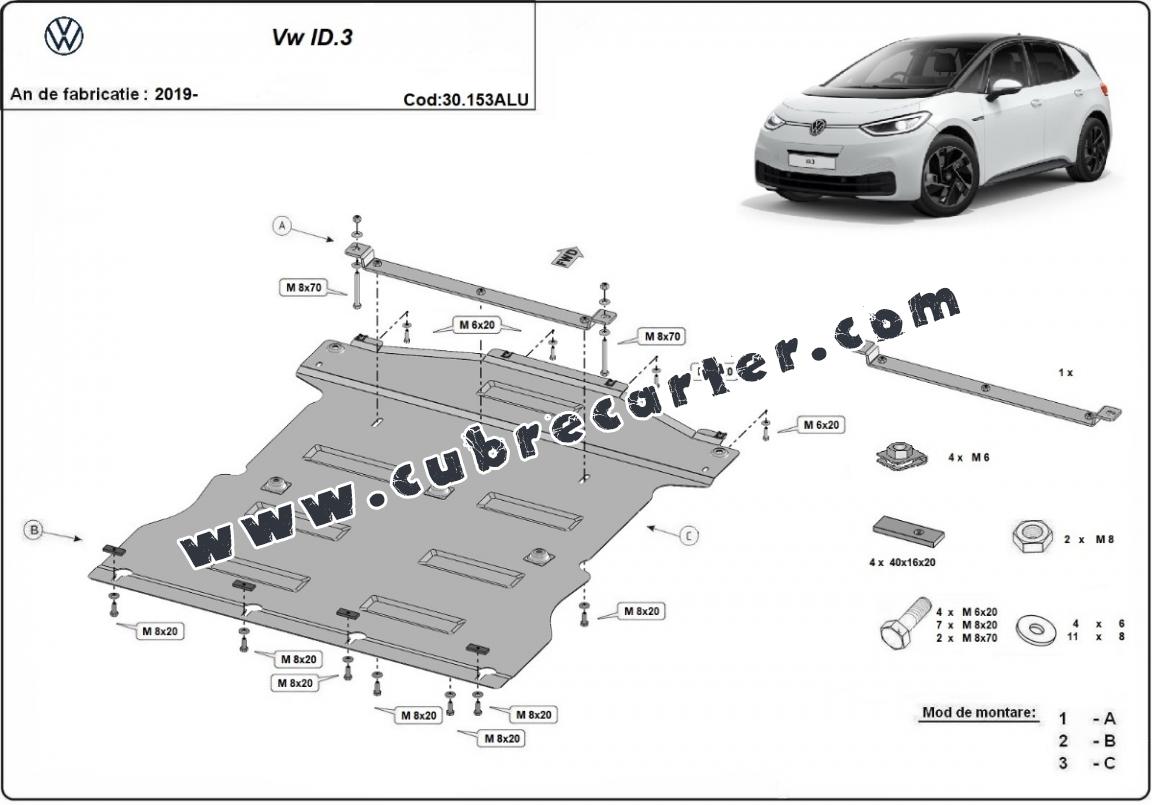 El cubre carter metalico es nuevo y se adapta perfectamente al Volkswagen ID.3, con las siguientes versiones de motor / accionamiento: toate, fabricado entre 2019 y 2025. La placa protega los siguientes: motor, caja de cambios, radiador Está preparado de chapa de Aluminio de 3 mm. Los escudos son de aluminio, pero los soportes de fijación son de acero. Cerrojos, calces y todos los accesorios incluidos. Todas las placas son estrachadas con pintura de polvo anticorrosivo. Las placas del protección del motor son equipados con braceares soldados para resistir mejor a los impactos exteriores. |