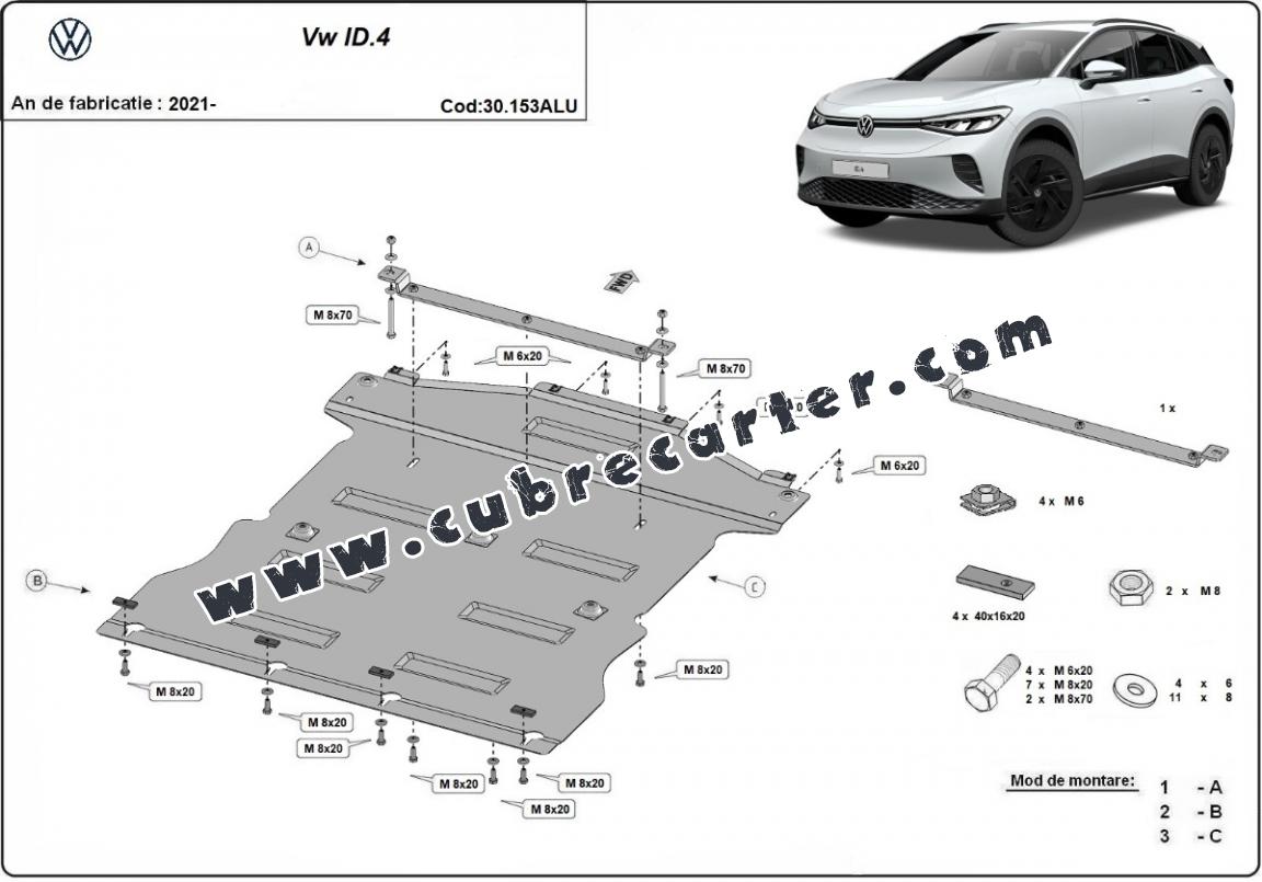 El cubre carter metalico es nuevo y se adapta perfectamente al Volkswagen ID.4, con las siguientes versiones de motor / accionamiento: toate, fabricado entre 2021 y 2025. La placa protega los siguientes: motor, caja de cambios, radiador Está preparado de chapa de Aluminio de 3 mm. Los escudos son de aluminio, pero los soportes de fijación son de acero. Cerrojos, calces y todos los accesorios incluidos. Todas las placas son estrachadas con pintura de polvo anticorrosivo. Las placas del protección del motor son equipados con braceares soldados para resistir mejor a los impactos exteriores. |