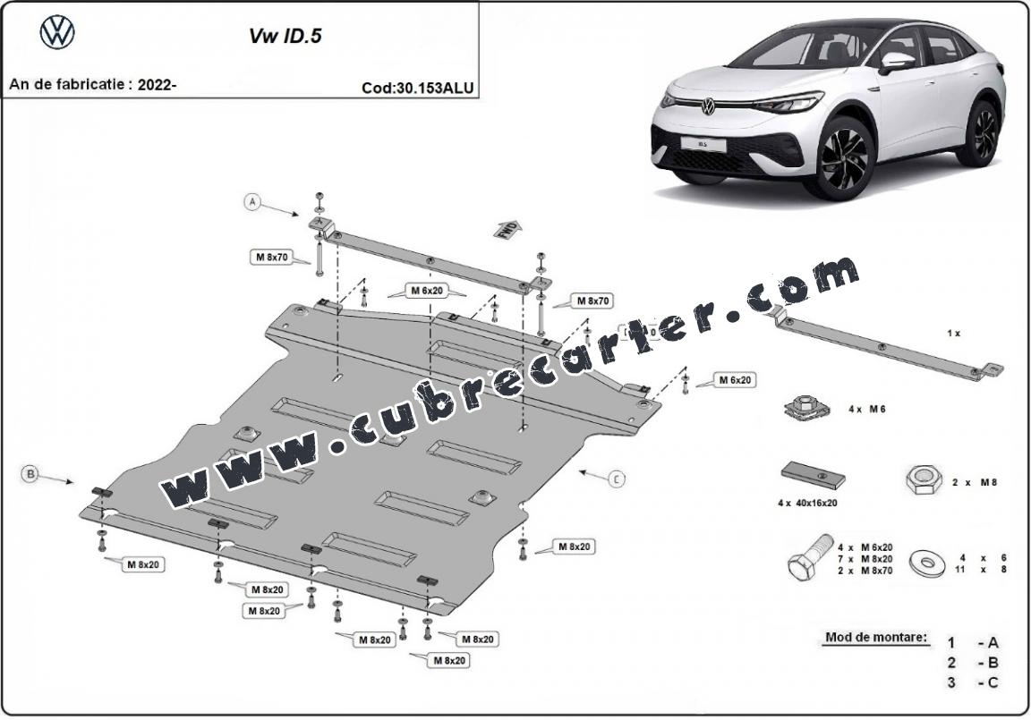 El cubre carter metalico es nuevo y se adapta perfectamente al Volkswagen ID.5, con las siguientes versiones de motor / accionamiento: toate, fabricado entre 2022 y 2025. La placa protega los siguientes: motor, caja de cambios, radiador Está preparado de chapa de Aluminio de 3 mm. Los escudos son de aluminio, pero los soportes de fijación son de acero. Cerrojos, calces y todos los accesorios incluidos. Todas las placas son estrachadas con pintura de polvo anticorrosivo. Las placas del protección del motor son equipados con braceares soldados para resistir mejor a los impactos exteriores. |