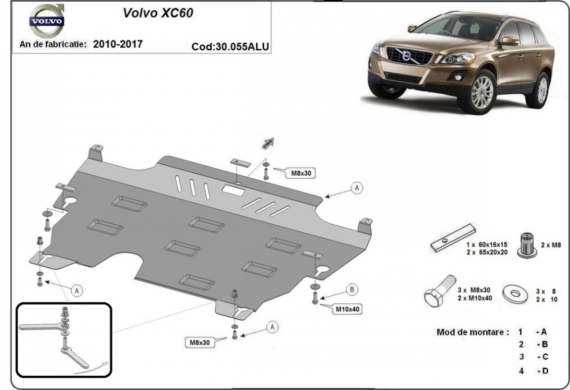 El cubre carter metalico es nuevo y se adapta perfectamente a todas las versiones de Volvo XC60 fabricadas entre 2010 y 2017. La placa protega los siguientes: motor, caja de cambios, radiador Está preparado de chapa de Aluminio de 3 mm. Los escudos son de aluminio, pero los soportes de fijación son de acero. Cerrojos, calces y todos los accesorios incluidos. Todas las placas son estrachadas con pintura de polvo anticorrosivo. Las placas del protección del motor son equipados con braceares soldados para resistir mejor a los impactos exteriores. |