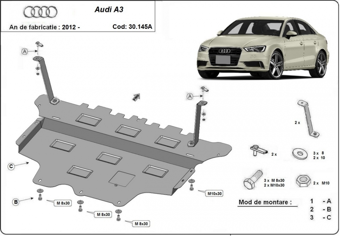 El cubre carter metalico es nuevo y se adapta perfectamente al Audi A3 , con las siguientes versiones de motor / accionamiento: toate, fabricado entre 2012 y 2020. La placa protega los siguientes: motor, caja de cambios, radiador, parachoques delantero Está preparado de chapa de Acero de 2 mm. Cerrojos, calces y todos los accesorios incluidos. Todas las placas son estrachadas con pintura de polvo anticorrosivo. Las placas del protección del motor son equipados con braceares soldados para resistir mejor a los impactos exteriores. |