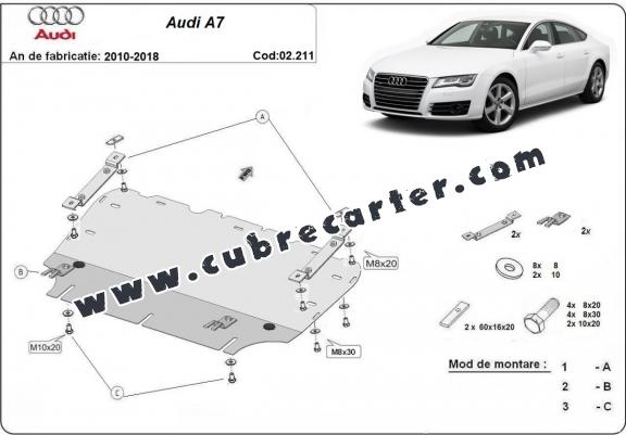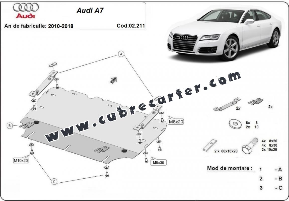 El cubre carter metalico es nuevo y se adapta perfectamente al Audi A7, con las siguientes versiones de motor / accionamiento: , fabricado entre 2011 y 2018. La placa protega los siguientes: motor, radiador Está preparado de chapa de Acero de 2 mm. Cerrojos, calces y todos los accesorios incluidos. Todas las placas son estrachadas con pintura de polvo anticorrosivo. Las placas del protección del motor son equipados con braceares soldados para resistir mejor a los impactos exteriores. |