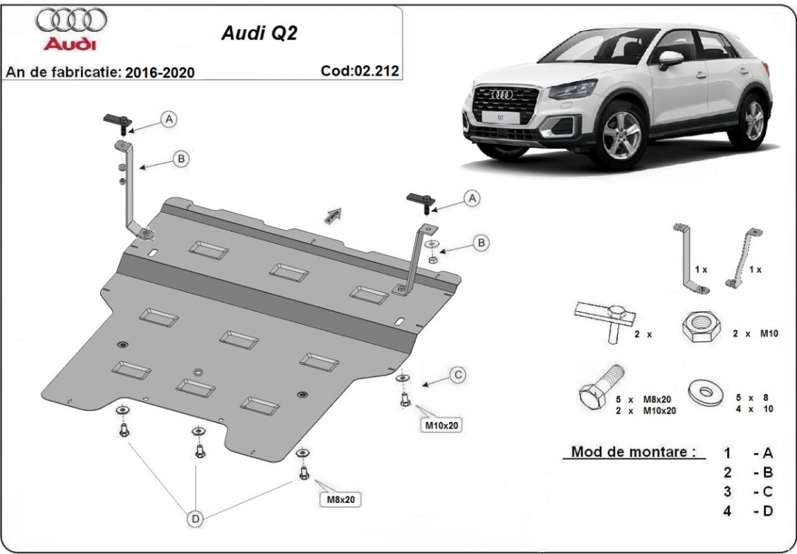 El cubre carter metalico es nuevo y se adapta perfectamente al Audi Q2, con las siguientes versiones de motor / accionamiento: toate, fabricado entre 2016 y 2020. La placa protega los siguientes: motor, caja de cambios, radiador Está preparado de chapa de Acero de 2 mm. Cerrojos, calces y todos los accesorios incluidos. Todas las placas son estrachadas con pintura de polvo anticorrosivo. Las placas del protección del motor son equipados con braceares soldados para resistir mejor a los impactos exteriores. |