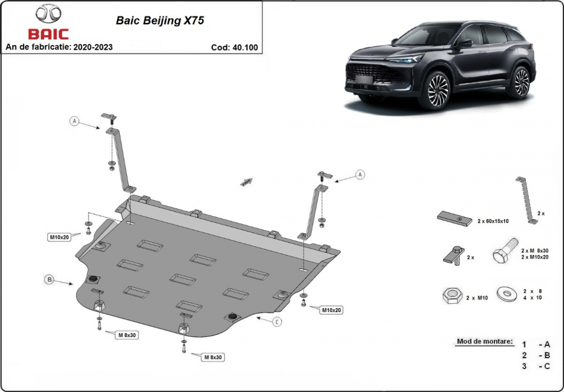 El cubre carter metalico es nuevo y se adapta perfectamente al Baic Beijing X75, con las siguientes versiones de motor / accionamiento: toate, fabricado entre 2020 y 2023. La placa protega los siguientes: motor, caja de cambios, radiador Está preparado de chapa de Acero de 2 mm. Cerrojos, calces y todos los accesorios incluidos. Todas las placas son estrachadas con pintura de polvo anticorrosivo. Las placas del protección del motor son equipados con braceares soldados para resistir mejor a los impactos exteriores. |