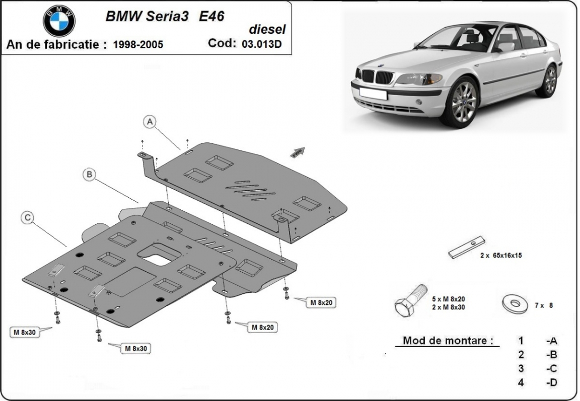 El cubre carter metalico es nuevo y se adapta perfectamente al BMW Seria 3 E46, con las siguientes versiones de motor / accionamiento: toate, fabricado entre 1998 y 2005. La placa protega los siguientes: motor, radiador, parachoques delantero Está preparado de chapa de Acero de 2 mm. Cerrojos, calces y todos los accesorios incluidos. Todas las placas son estrachadas con pintura de polvo anticorrosivo. Las placas del protección del motor son equipados con braceares soldados para resistir mejor a los impactos exteriores. |