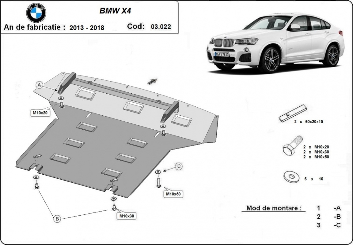 El cubre carter metalico es nuevo y se adapta perfectamente al BMW X4, con las siguientes versiones de motor / accionamiento: toate, fabricado entre 2014 y 2018. La placa protega los siguientes: motor, radiador, parachoques delantero Está preparado de chapa de Acero de 2 mm. Cerrojos, calces y todos los accesorios incluidos. Todas las placas son estrachadas con pintura de polvo anticorrosivo. Las placas del protección del motor son equipados con braceares soldados para resistir mejor a los impactos exteriores. |