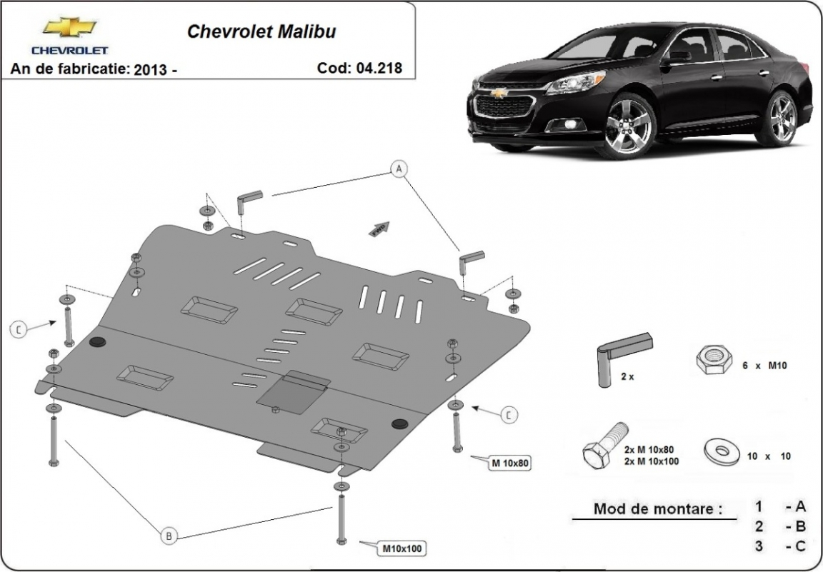 El cubre carter metalico es nuevo y se adapta perfectamente a todas las versiones de Chevrolet Malibu fabricadas entre 2013 y 2015. La placa protega los siguientes: motor, caja de cambios, radiador Montada con salida de petróleo descendido así que no es necesario el cambio del petróleo cuando se quita la placa. Está preparado de chapa de Acero de 2 mm. Cerrojos, calces y todos los accesorios incluidos. Todas las placas son estrachadas con pintura de polvo anticorrosivo. Las placas del protección del motor son equipados con braceares soldados para resistir mejor a los impactos exteriores. |