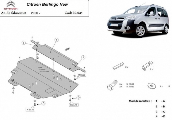 El cubre carter metalico es nuevo y se adapta perfectamente a todas las versiones de Citroen Berlingo fabricadas entre 2008 y 2018. La placa protega los siguientes: motor, caja de cambios, radiador Montada con salida de petróleo descendido así que no es necesario el cambio del petróleo cuando se quita la placa. Está preparado de chapa de Acero de 2 mm. Cerrojos, calces y todos los accesorios incluidos. Todas las placas son estrachadas con pintura de polvo anticorrosivo. Las placas del protección del motor son equipados con braceares soldados para resistir mejor a los impactos exteriores. |