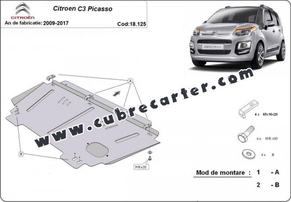 El cubre carter metalico es nuevo y se adapta perfectamente al Citroen C3 Picasso, con las siguientes versiones de motor / accionamiento: toate, fabricado entre 2009 y 2017. La placa protega los siguientes: motor, caja de cambios Montada con salida de petróleo descendido así que no es necesario el cambio del petróleo cuando se quita la placa. Está preparado de chapa de Acero de 2 mm. Cerrojos, calces y todos los accesorios incluidos. Todas las placas son estrachadas con pintura de polvo anticorrosivo. Las placas del protección del motor son equipados con braceares soldados para resistir mejor a los impactos exteriores. |