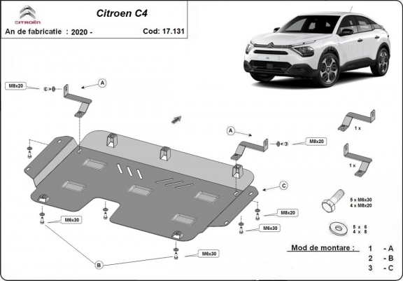 El cubre carter metalico es nuevo y se adapta perfectamente a todas las versiones de Citroen C4 fabricadas entre 2020 y 2026. La placa protega los siguientes: motor, caja de cambios, radiador Está preparado de chapa de Acero de 2 mm. Cerrojos, calces y todos los accesorios incluidos. Todas las placas son estrachadas con pintura de polvo anticorrosivo. Las placas del protección del motor son equipados con braceares soldados para resistir mejor a los impactos exteriores. |