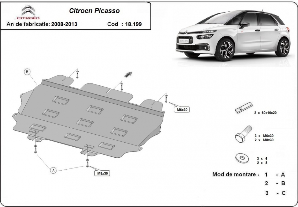 El cubre carter metalico es nuevo y se adapta perfectamente al Citroen C4 Picasso, con las siguientes versiones de motor / accionamiento: toate, fabricado entre 2008 y 2013. La placa protega los siguientes: motor, caja de cambios, radiador Está preparado de chapa de Acero de 2 mm. Cerrojos, calces y todos los accesorios incluidos. Todas las placas son estrachadas con pintura de polvo anticorrosivo. Las placas del protección del motor son equipados con braceares soldados para resistir mejor a los impactos exteriores. |
