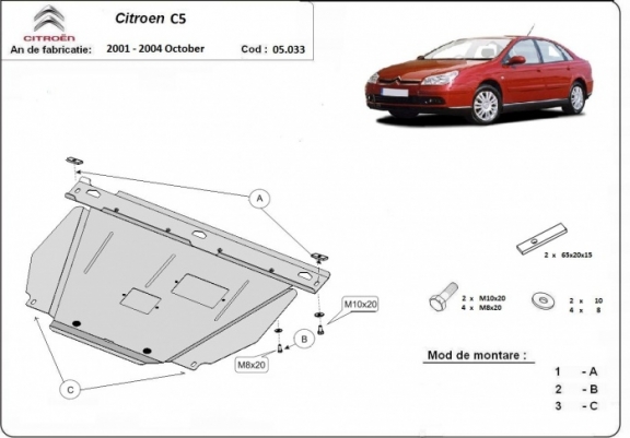 El cubre carter metalico es nuevo y se adapta perfectamente a todas las versiones de Citroen C5 fabricadas entre 2001 y 2004. La placa protega los siguientes: motor, caja de cambios Montada con salida de petróleo descendido así que no es necesario el cambio del petróleo cuando se quita la placa. Está preparado de chapa de Acero de 2 mm. Cerrojos, calces y todos los accesorios incluidos. Todas las placas son estrachadas con pintura de polvo anticorrosivo. Las placas del protección del motor son equipados con braceares soldados para resistir mejor a los impactos exteriores. |