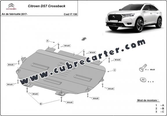 El cubre carter metalico es nuevo y se adapta perfectamente al Citroen DS 7 Crossback, con las siguientes versiones de motor / accionamiento: toate, fabricado entre 2017 y 2025. La placa protega los siguientes: motor, caja de cambios, radiador Está preparado de chapa de Acero de 2 mm. Cerrojos, calces y todos los accesorios incluidos. Todas las placas son estrachadas con pintura de polvo anticorrosivo. Las placas del protección del motor son equipados con braceares soldados para resistir mejor a los impactos exteriores. |