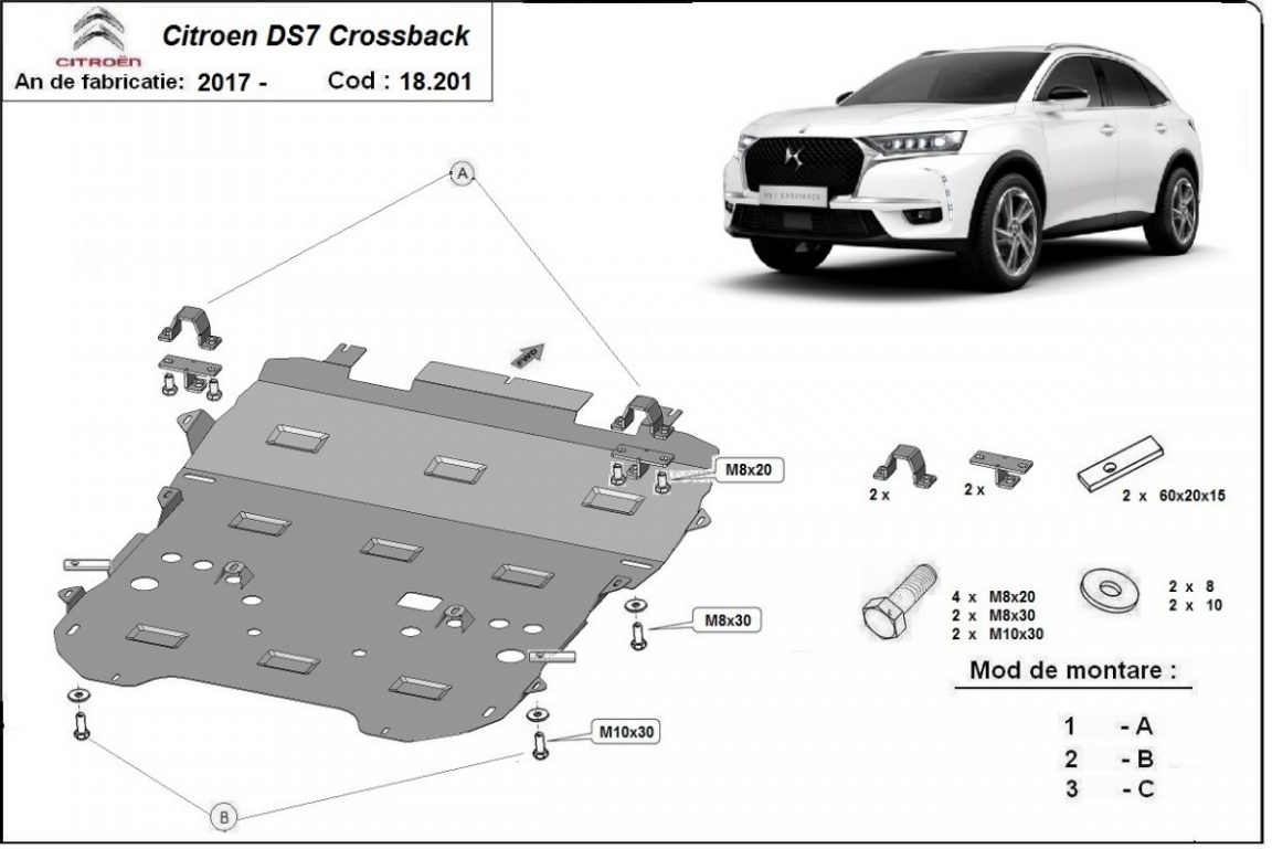 El cubre carter metalico es nuevo y se adapta perfectamente al Citroen DS7 Crossback, con las siguientes versiones de motor / accionamiento: toate, fabricado entre 2017 y 2026. La placa protega los siguientes: motor, caja de cambios, radiador, parachoques delantero, subchasis Está preparado de chapa de Acero de 2 mm. Cerrojos, calces y todos los accesorios incluidos. Todas las placas son estrachadas con pintura de polvo anticorrosivo. Las placas del protección del motor son equipados con braceares soldados para resistir mejor a los impactos exteriores. |