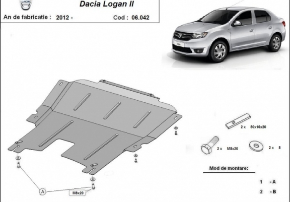 El cubre carter metalico es nuevo y se adapta perfectamente al Dacia Logan 2, con las siguientes versiones de motor / accionamiento: toate, fabricado entre 2012 y 2020. La placa protega los siguientes: motor, caja de cambios Está preparado de chapa de Acero de 2 mm. Cerrojos, calces y todos los accesorios incluidos. Todas las placas son estrachadas con pintura de polvo anticorrosivo. Las placas del protección del motor son equipados con braceares soldados para resistir mejor a los impactos exteriores. |