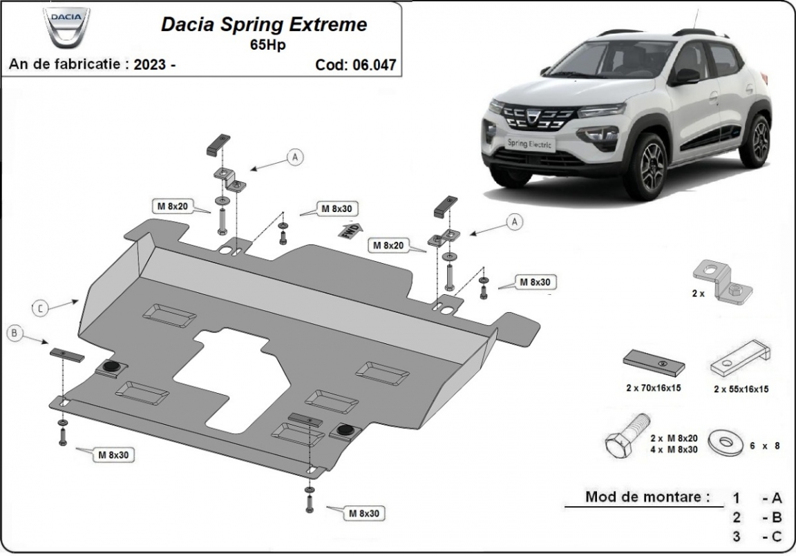 El cubre carter metalico es nuevo y se adapta perfectamente a todas las versiones de Dacia Spring fabricadas entre 2023 y 2026. La placa protega los siguientes: motor, caja de cambios Está preparado de chapa de Acero de 2 mm. Cerrojos, calces y todos los accesorios incluidos. Todas las placas son estrachadas con pintura de polvo anticorrosivo. Las placas del protección del motor son equipados con braceares soldados para resistir mejor a los impactos exteriores. |