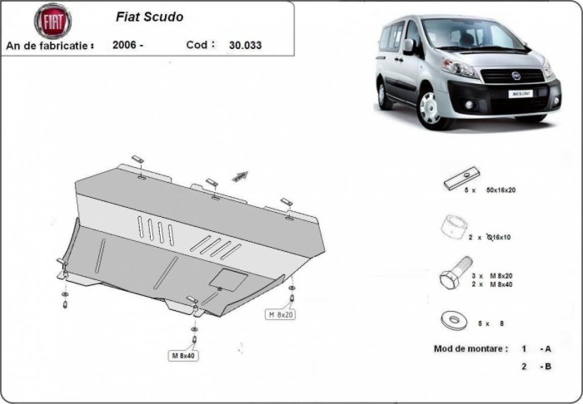 El cubre carter metalico es nuevo y se adapta perfectamente a todas las versiones de Fiat Scudo fabricadas entre 2006 y 2016. La placa protega los siguientes: motor, caja de cambios, radiador Montada con salida de petróleo descendido así que no es necesario el cambio del petróleo cuando se quita la placa. Está preparado de chapa de Acero de 2 mm. Cerrojos, calces y todos los accesorios incluidos. Todas las placas son estrachadas con pintura de polvo anticorrosivo. Las placas del protección del motor son equipados con braceares soldados para resistir mejor a los impactos exteriores. |
