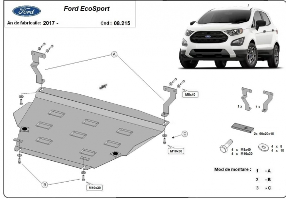 El cubre carter metalico es nuevo y se adapta perfectamente al Ford EcoSport, con las siguientes versiones de motor / accionamiento: toate, fabricado entre 2017 y 2026. La placa protega los siguientes: motor, caja de cambios, radiador Está preparado de chapa de Acero de 2 mm. Cerrojos, calces y todos los accesorios incluidos. Todas las placas son estrachadas con pintura de polvo anticorrosivo. Las placas del protección del motor son equipados con braceares soldados para resistir mejor a los impactos exteriores. |