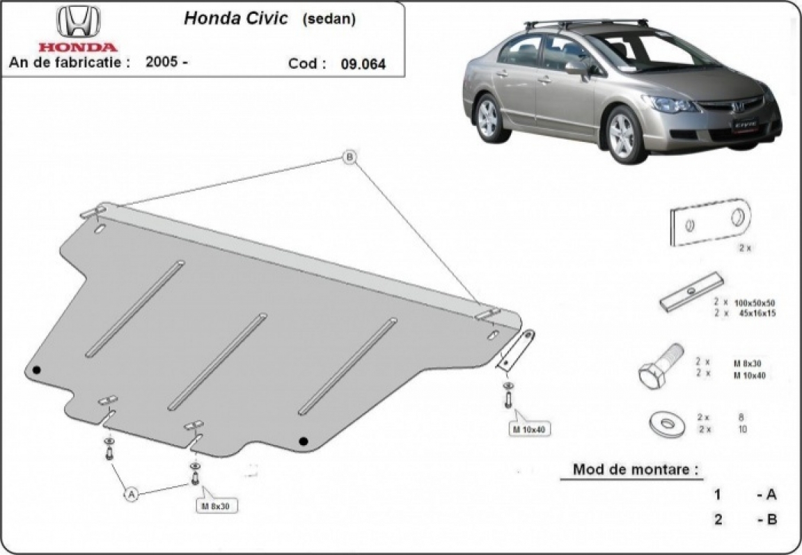 El cubre carter metalico es nuevo y se adapta perfectamente a todas las versiones de Honda Civic (berlin) fabricadas entre 2005 y 2015. La placa protega los siguientes: motor, caja de cambios Está preparado de chapa de Acero de 2 mm. Cerrojos, calces y todos los accesorios incluidos. Todas las placas son estrachadas con pintura de polvo anticorrosivo. Las placas del protección del motor son equipados con braceares soldados para resistir mejor a los impactos exteriores. |