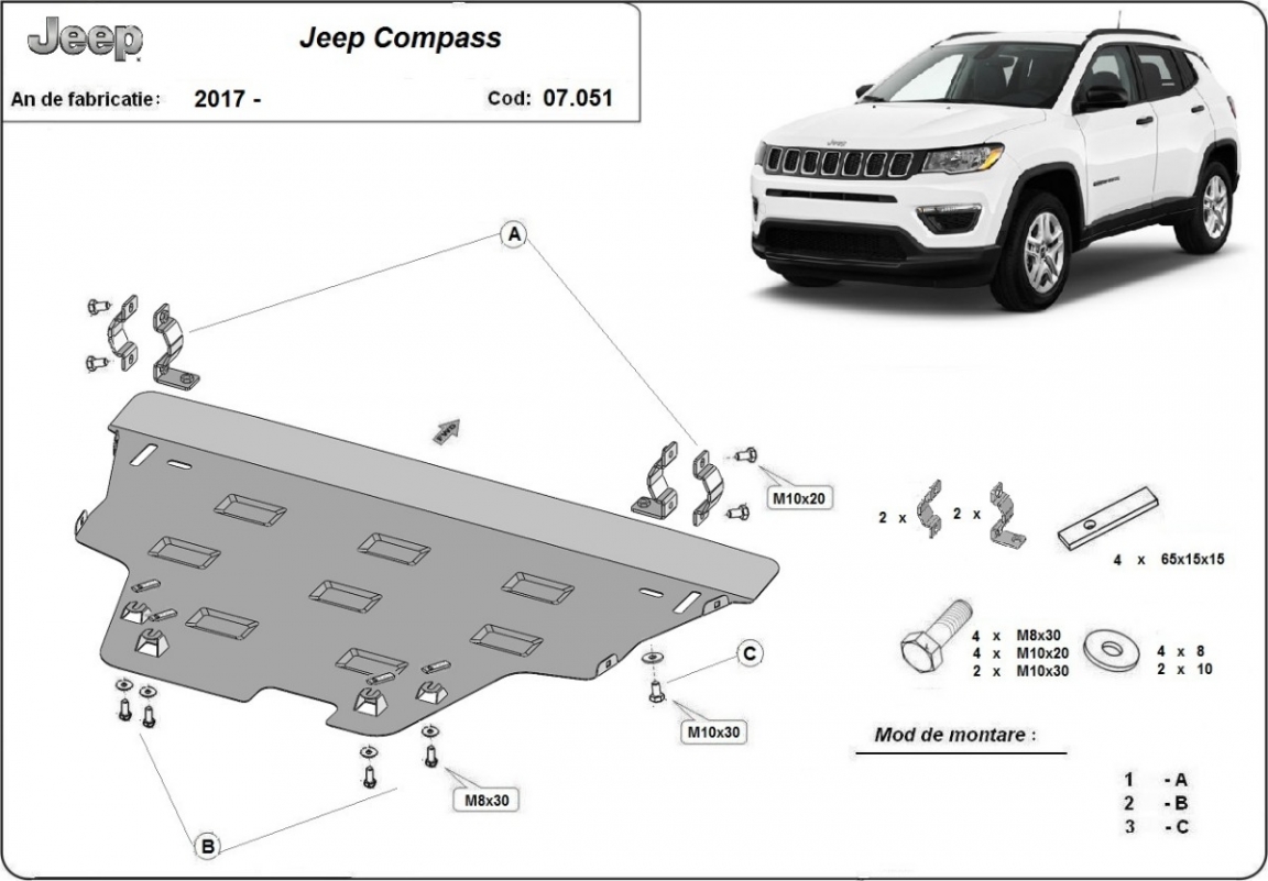Protection moteur boite pour Jeep Compass2 4x4. Tôle de qualité, épaisseur suffisante, livrée peinte. Vis prévues pour les colliers de fixation trop courte, prévoir 4 vis HM10x30 ou CHc 10x30 au lieu des 10x20, personnellement j'ai choisi de l'inox plutôt que l'acier zingué.