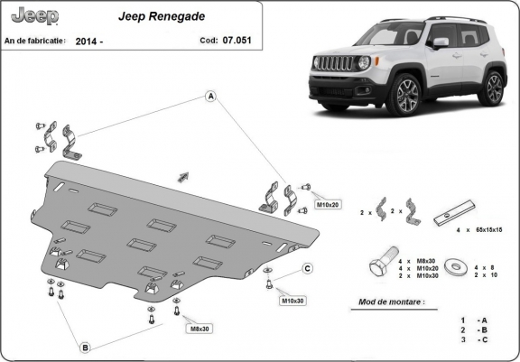 El cubre carter metalico es nuevo y se adapta perfectamente al Jeep Renegade, con las siguientes versiones de motor / accionamiento: toate, fabricado entre 2014 y 2026. La placa protega los siguientes: motor, caja de cambios, radiador, parachoques delantero Está preparado de chapa de Acero de 2 mm. Cerrojos, calces y todos los accesorios incluidos. Todas las placas son estrachadas con pintura de polvo anticorrosivo. Las placas del protección del motor son equipados con braceares soldados para resistir mejor a los impactos exteriores. |