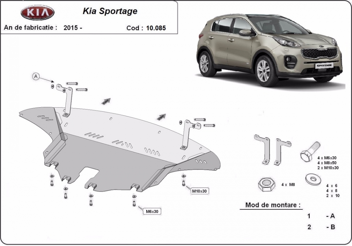 El cubre carter metalico es nuevo y se adapta perfectamente a todas las versiones de Kia Sportage fabricadas entre 2015 y 2019. La placa protega los siguientes: motor, caja de cambios, radiador, parachoques delantero Está preparado de chapa de Acero de 2 mm. Cerrojos, calces y todos los accesorios incluidos. Todas las placas son estrachadas con pintura de polvo anticorrosivo. Las placas del protección del motor son equipados con braceares soldados para resistir mejor a los impactos exteriores. |