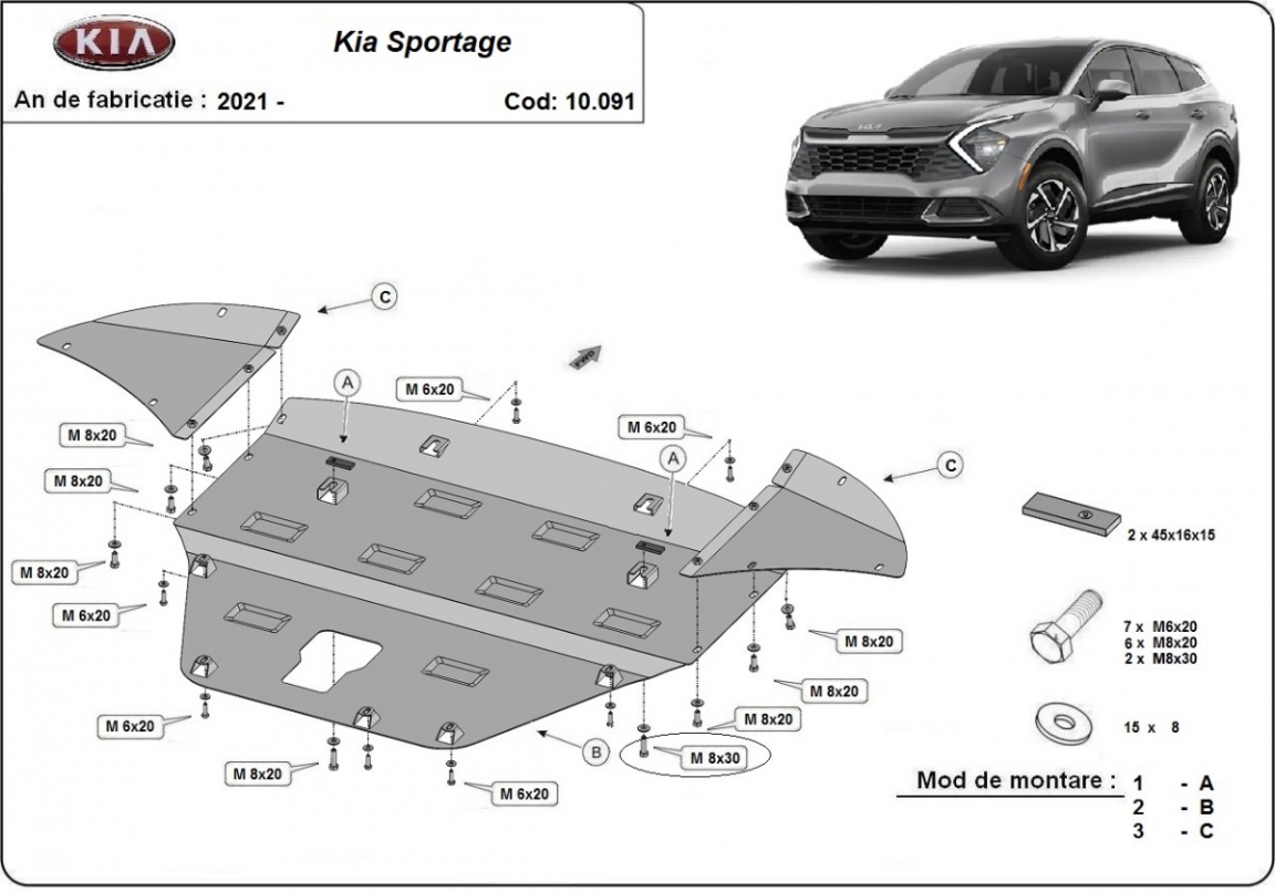 El cubre carter metalico es nuevo y se adapta perfectamente al Kia Sportage, con las siguientes versiones de motor / accionamiento: toate, fabricado entre 2021 y 2026. La placa protega los siguientes: motor, caja de cambios, radiador, parachoques delantero Está preparado de chapa de Acero de 2 mm. Cerrojos, calces y todos los accesorios incluidos. Todas las placas son estrachadas con pintura de polvo anticorrosivo. Las placas del protección del motor son equipados con braceares soldados para resistir mejor a los impactos exteriores. |