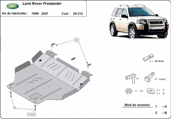 El cubre carter metalico es nuevo y se adapta perfectamente al Land Rover Freelander, con las siguientes versiones de motor / accionamiento: toate, fabricado entre 1998 y 2007. La placa protega los siguientes: motor, caja de cambios Montada con salida de petróleo descendido así que no es necesario el cambio del petróleo cuando se quita la placa. Está preparado de chapa de Acero de 3 mm. Cerrojos, calces y todos los accesorios incluidos. Todas las placas son estrachadas con pintura de polvo anticorrosivo. Las placas del protección del motor son equipados con braceares soldados para resistir mejor a los impactos exteriores. |