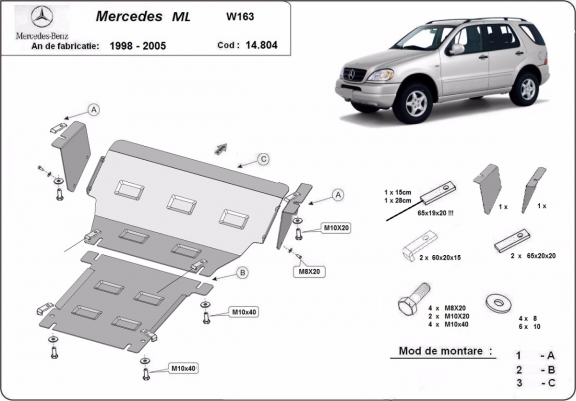 El cubre carter metalico es nuevo y se adapta perfectamente al Mercedes ML W163, con las siguientes versiones de motor / accionamiento: toate, fabricado entre 1998 y 2005. La placa protega los siguientes: motor, radiador, parachoques delantero Está preparado de chapa de Acero de 3 mm. Cerrojos, calces y todos los accesorios incluidos. Todas las placas son estrachadas con pintura de polvo anticorrosivo. Las placas del protección del motor son equipados con braceares soldados para resistir mejor a los impactos exteriores. |