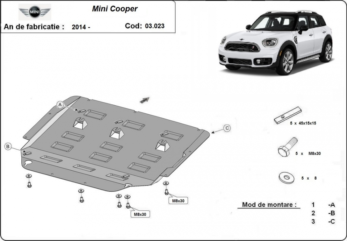 El cubre carter metalico es nuevo y se adapta perfectamente al Mini Cooper , con las siguientes versiones de motor / accionamiento: toate, fabricado entre 2014 y 2026. La placa protega los siguientes: motor, caja de cambios, radiador Está preparado de chapa de Acero de 2 mm. Cerrojos, calces y todos los accesorios incluidos. Todas las placas son estrachadas con pintura de polvo anticorrosivo. Las placas del protección del motor son equipados con braceares soldados para resistir mejor a los impactos exteriores. |