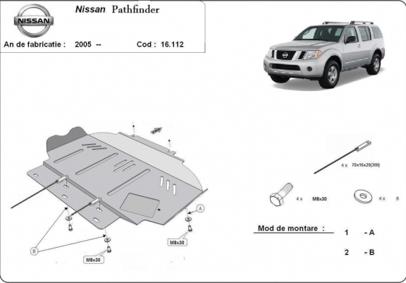 El cubre carter metalico es nuevo y se adapta perfectamente al Nissan Pathfinder, con las siguientes versiones de motor / accionamiento: toate, fabricado entre 2005 y 2015. La placa protega los siguientes: motor Montada con salida de petróleo descendido así que no es necesario el cambio del petróleo cuando se quita la placa. Está preparado de chapa de Acero de 3 mm. Cerrojos, calces y todos los accesorios incluidos. Todas las placas son estrachadas con pintura de polvo anticorrosivo. Las placas del protección del motor son equipados con braceares soldados para resistir mejor a los impactos exteriores. |