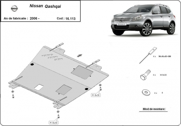 El cubre carter metalico es nuevo y se adapta perfectamente al Nissan Qashqai, con las siguientes versiones de motor / accionamiento: 1.6, 2.0, fabricado entre 2006 y 2013. La placa protega los siguientes: motor, caja de cambios Montada con salida de petróleo descendido así que no es necesario el cambio del petróleo cuando se quita la placa. Está preparado de chapa de Acero de 2 mm. Cerrojos, calces y todos los accesorios incluidos. Todas las placas son estrachadas con pintura de polvo anticorrosivo. Las placas del protección del motor son equipados con braceares soldados para resistir mejor a los impactos exteriores. |