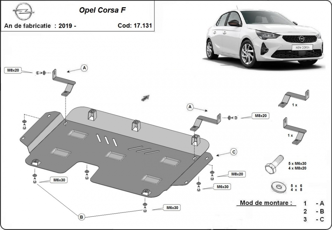 El cubre carter metalico es nuevo y se adapta perfectamente al Opel Corsa F, con las siguientes versiones de motor / accionamiento: toate, fabricado entre 2019 y 2026. La placa protega los siguientes: motor, caja de cambios, radiador Está preparado de chapa de Acero de 2 mm. Cerrojos, calces y todos los accesorios incluidos. Todas las placas son estrachadas con pintura de polvo anticorrosivo. Las placas del protección del motor son equipados con braceares soldados para resistir mejor a los impactos exteriores. |