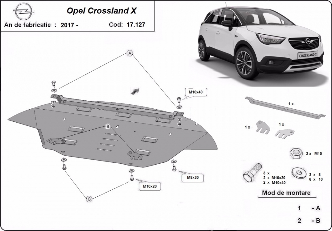 El cubre carter metalico es nuevo y se adapta perfectamente a todas las versiones de Opel Crossland X fabricadas entre 2017 y 2026. La placa protega los siguientes: motor, caja de cambios, radiador, parachoques delantero Está preparado de chapa de Acero de 2 mm. Cerrojos, calces y todos los accesorios incluidos. Todas las placas son estrachadas con pintura de polvo anticorrosivo. Las placas del protección del motor son equipados con braceares soldados para resistir mejor a los impactos exteriores. |
