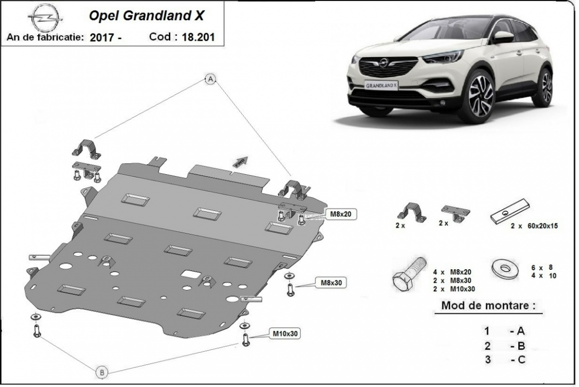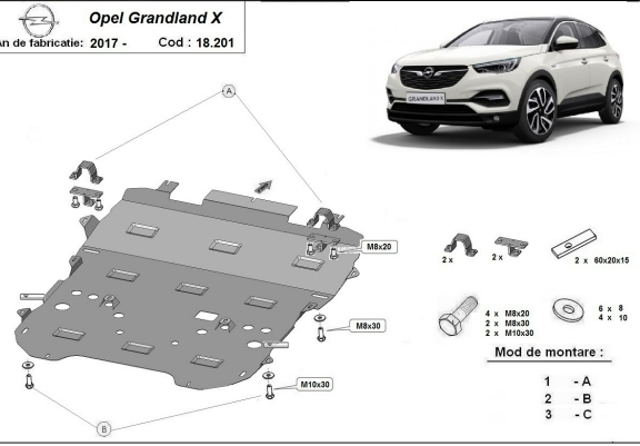 El cubre carter metalico es nuevo y se adapta perfectamente al Opel Grandland X, con las siguientes versiones de motor / accionamiento: toate, fabricado entre 2017 y 2026. La placa protega los siguientes: motor, caja de cambios, radiador, parachoques delantero, subchasis Está preparado de chapa de Acero de 2 mm. Cerrojos, calces y todos los accesorios incluidos. Todas las placas son estrachadas con pintura de polvo anticorrosivo. Las placas del protección del motor son equipados con braceares soldados para resistir mejor a los impactos exteriores. |